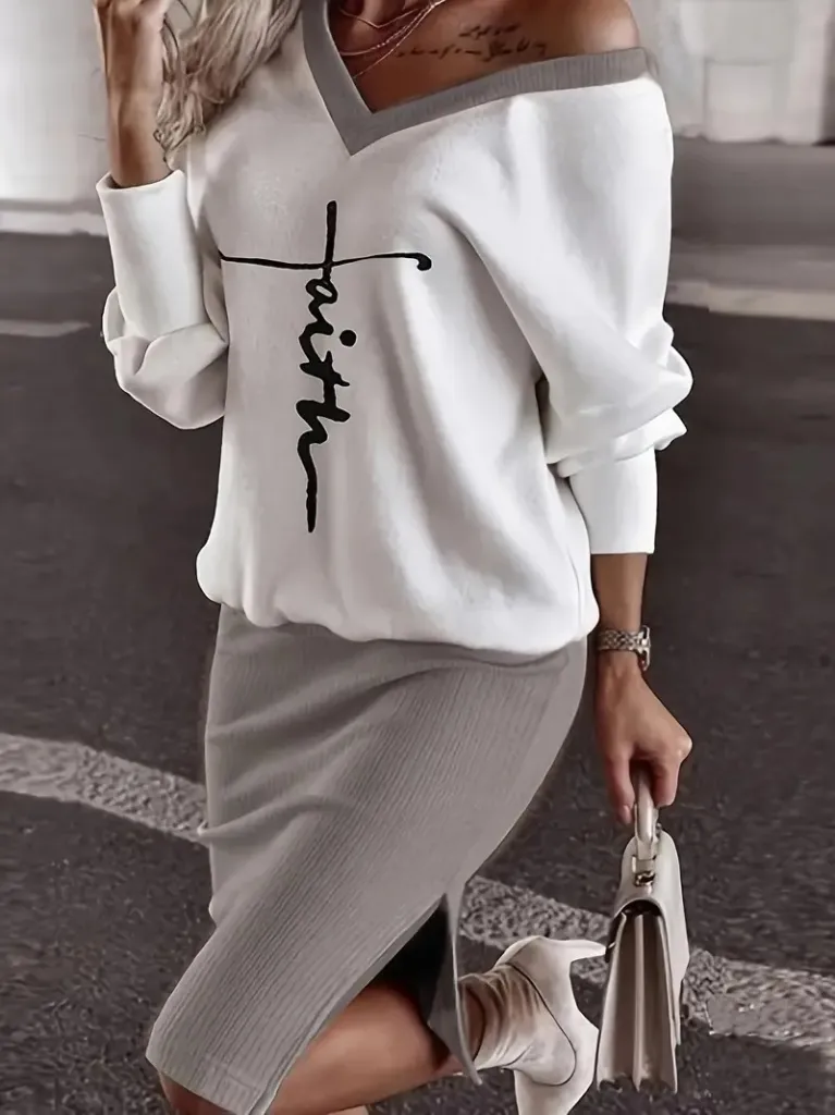 طقم تنورة برقبة القميص بنصف كم وتفاصيل مخرمة وأزرار أمامية