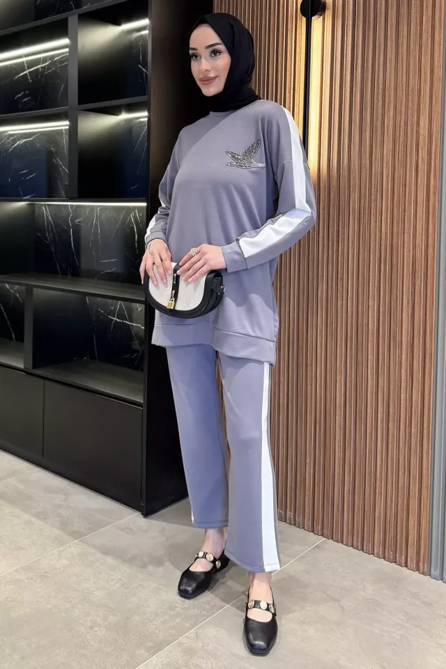 طقم كيمونو وبنطال منقوش بكتف منسدل وحزام للنساء
