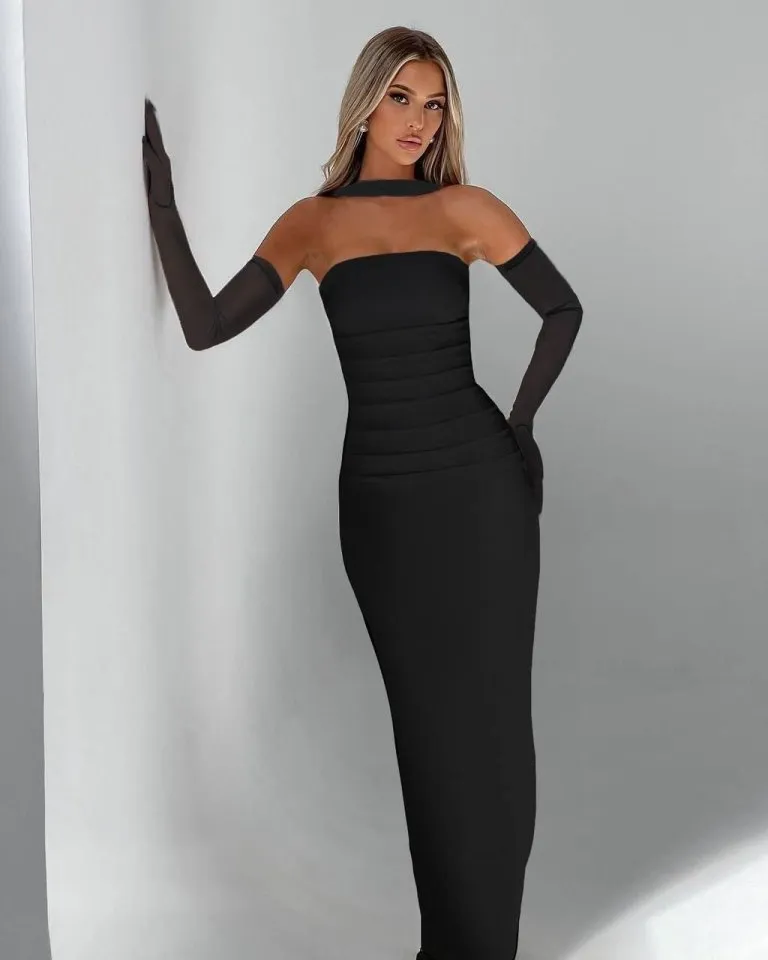 فستان حفلات نسائي بدون أكمام مع رقبة على شكل حرف V وتفاصيل اهداب