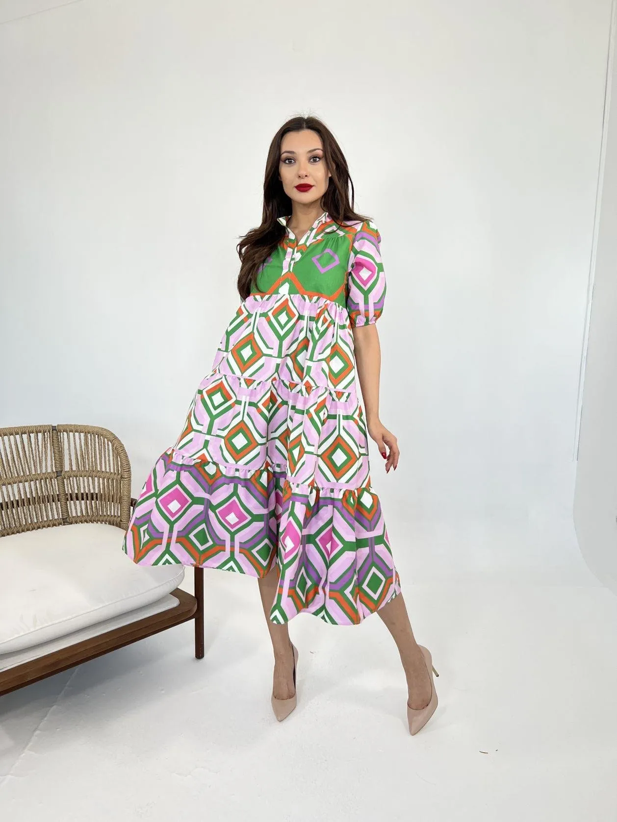 فستان نسائي كاجوال متوسط ​​الطول بأكمام قصيرة ورقبة دائرية
