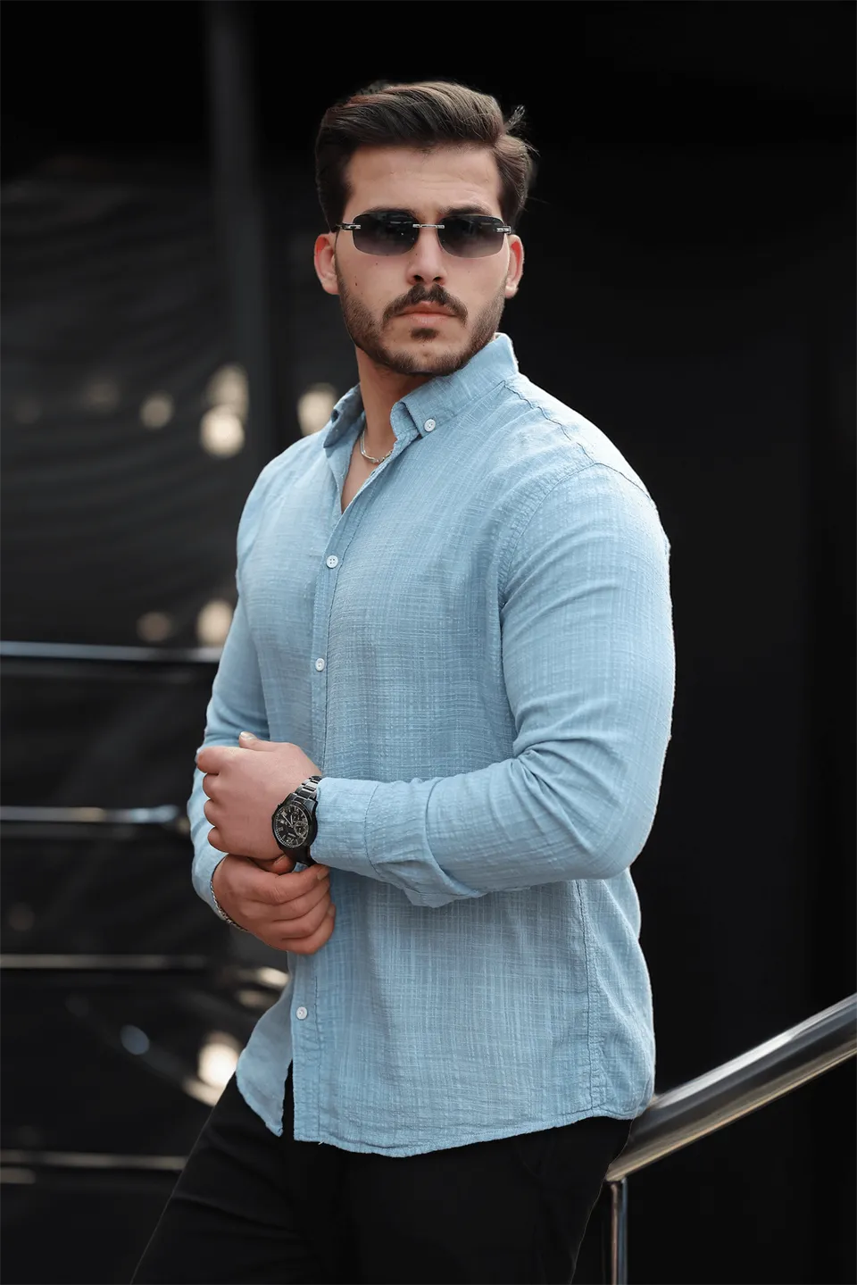 قميص كتان مخطط بخطوط عمودية – أناقة عصرية ومظهر راقٍ