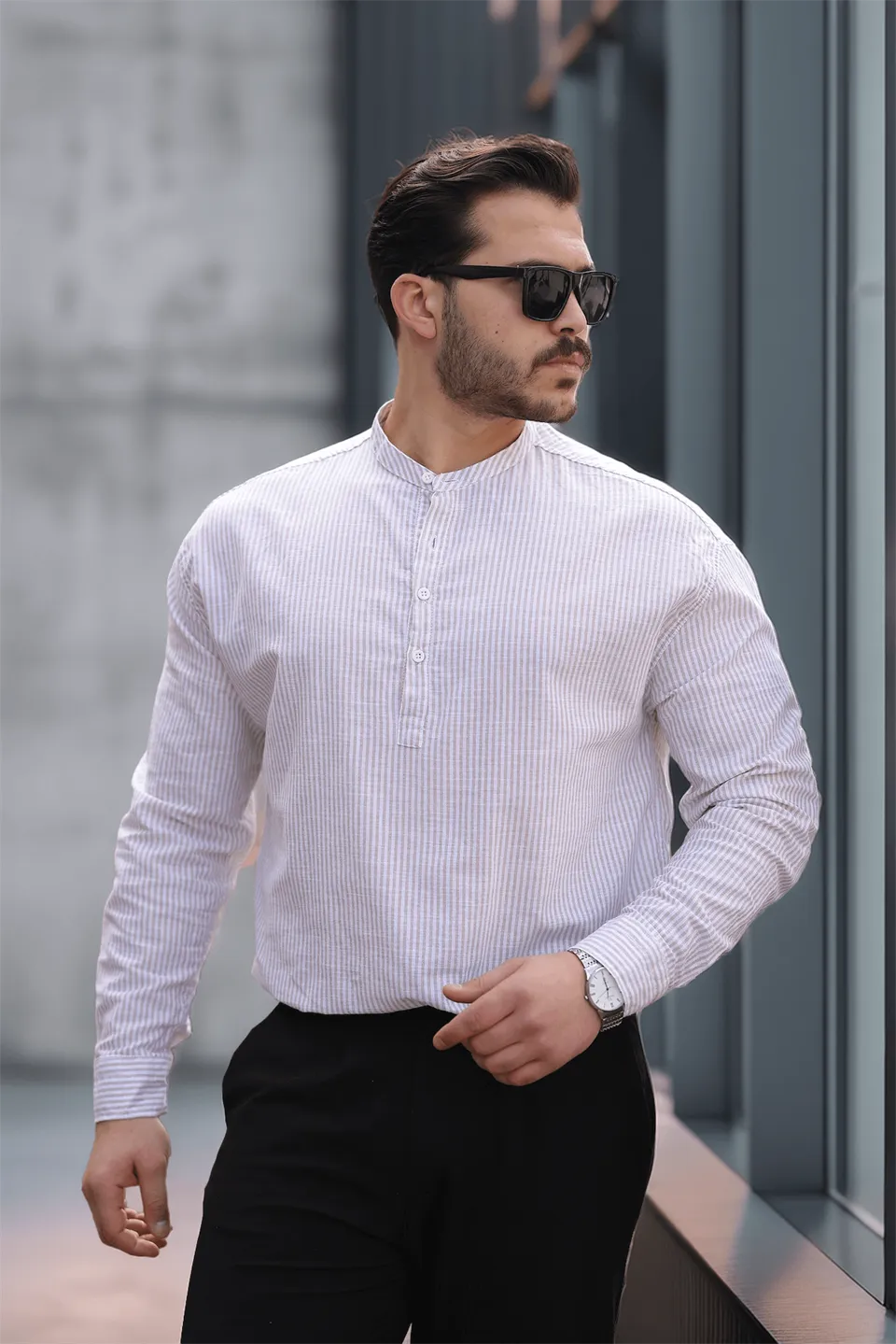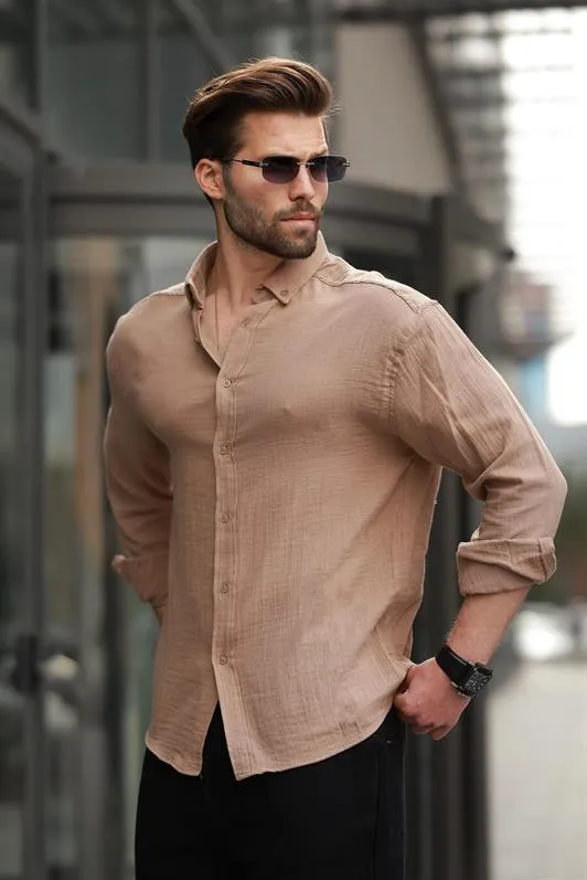 قميص رجالي مجعد بأكمام طويلة وياقة كلاسيكية