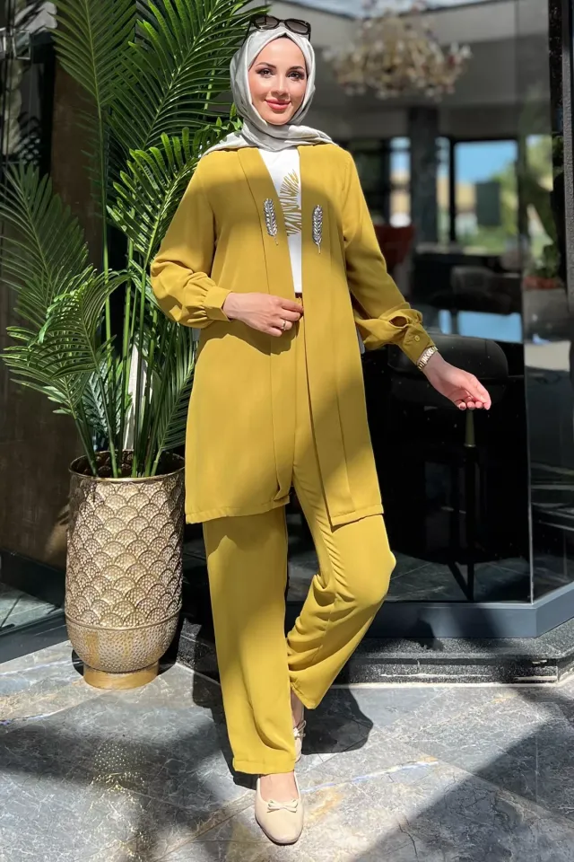 طقم تونيك مضلع بياقة قميص وأكتاف منسدلة وبنطلون بأرجل واسعة للنساء