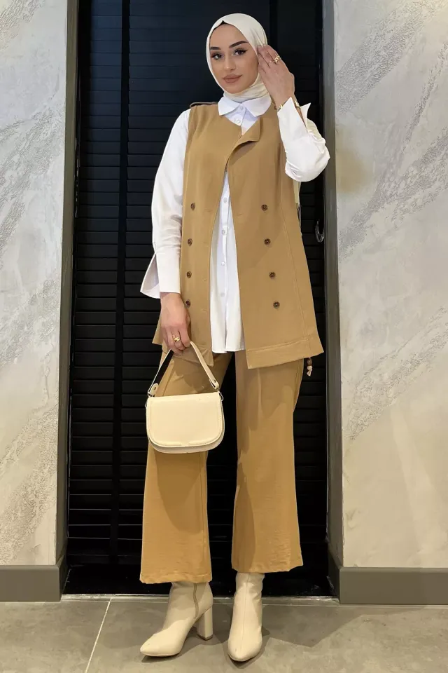 طقم تونيك سادة بحزام جانبي مزدوج الصدر للنساء