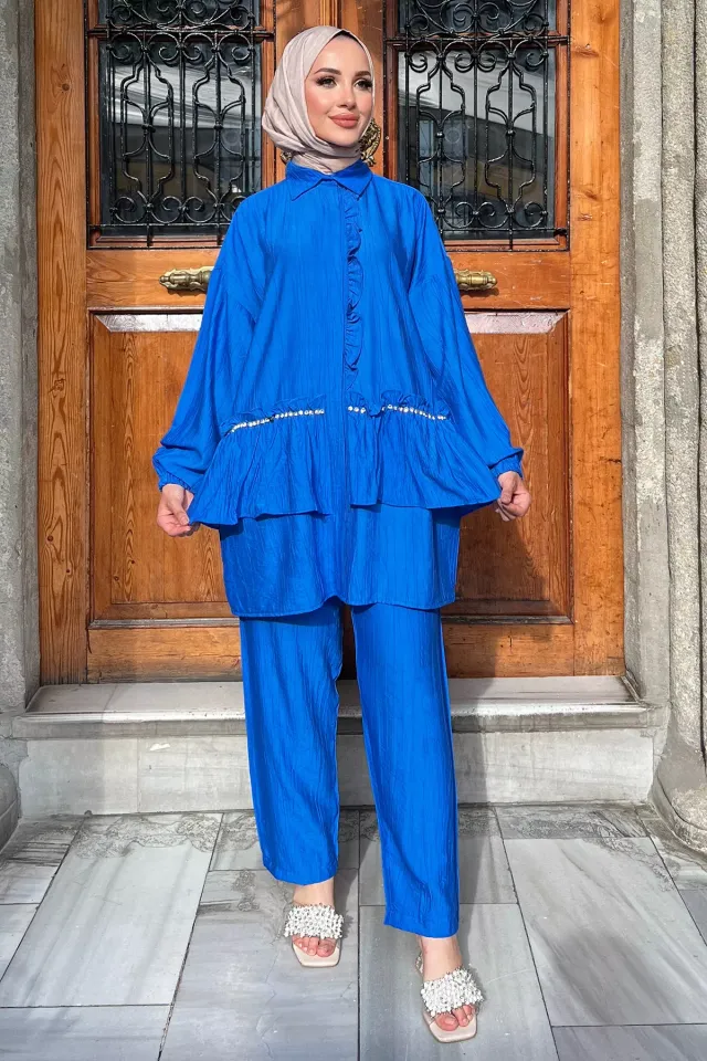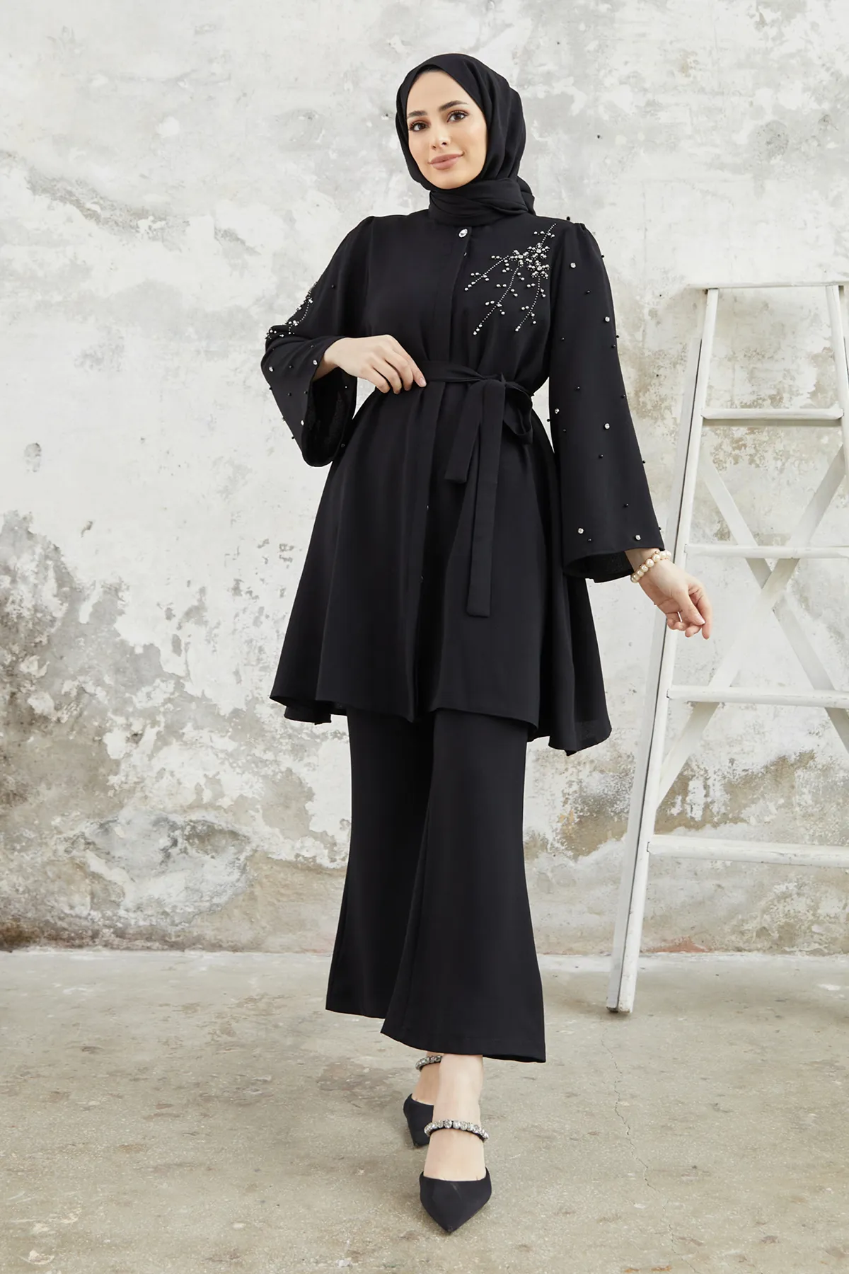 سترة أمامية بأزرار مخفية، بها تفاصيل من الأحجار واللؤلؤ