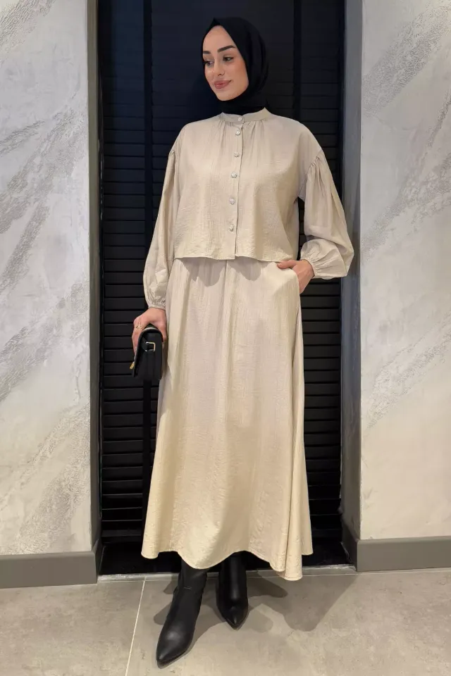 طقم تونيك وبنطلون بحزام مزين باللؤلؤ وأكمام واسعة مزمومة من الاسفل للسيدات