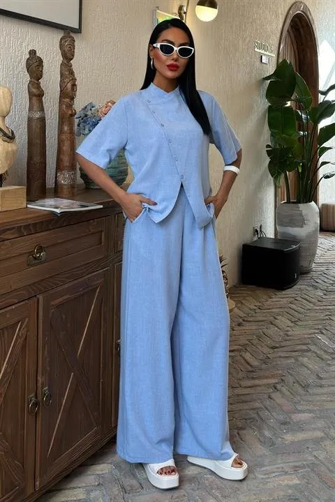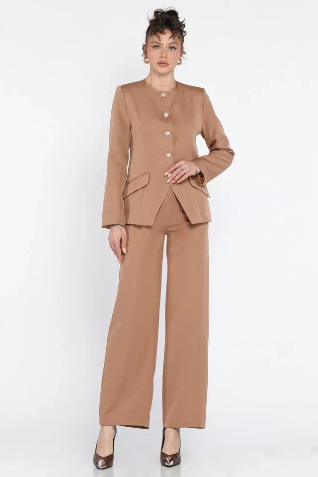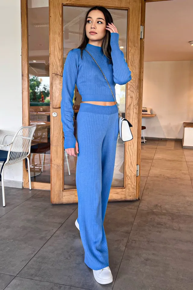 طقم بنطال مضلع سادة بأكمام طويلة وقصة ضيقة