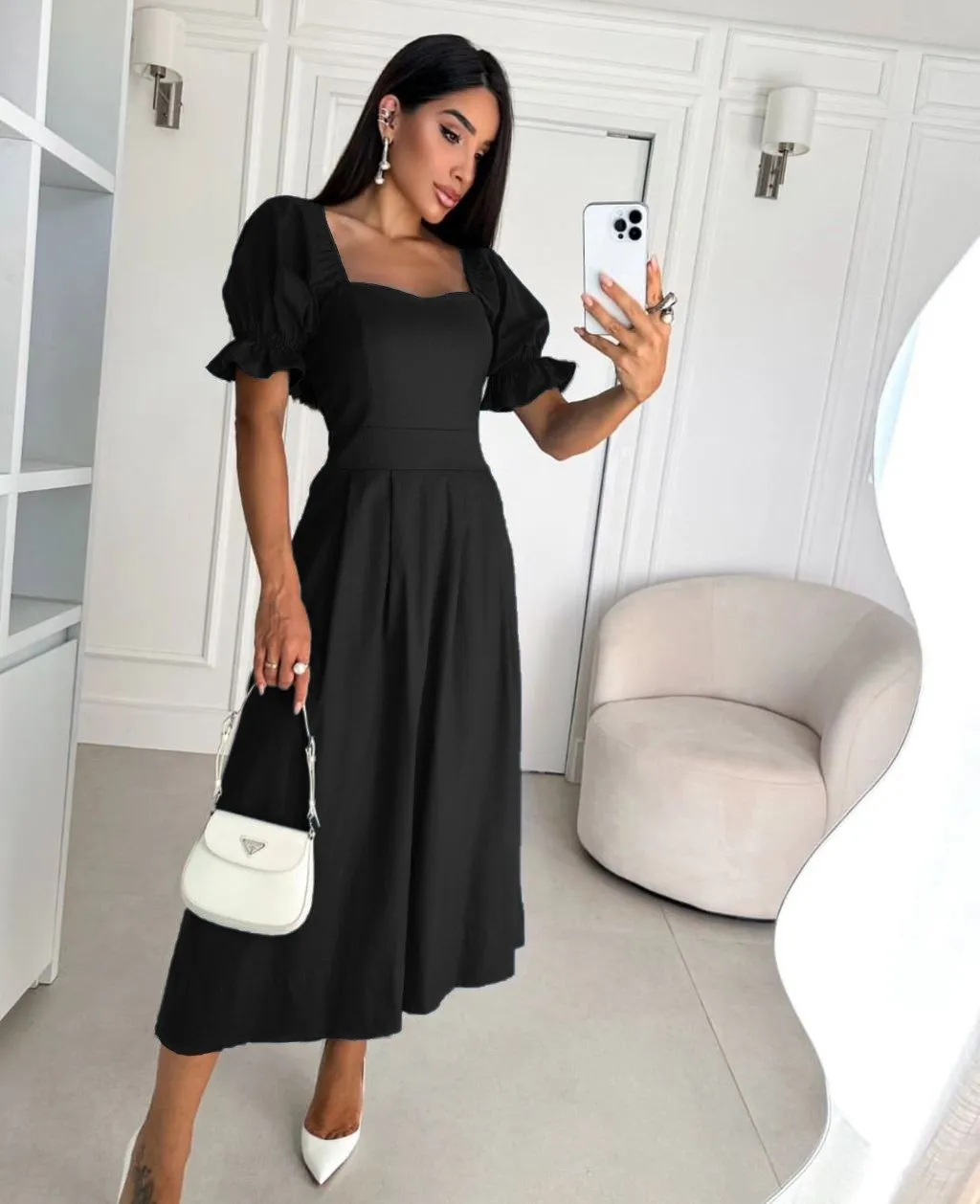 فستان قصير كاجوال محبوك بأكمام طويلة ورقبة على شكل حرف V بلون موحد