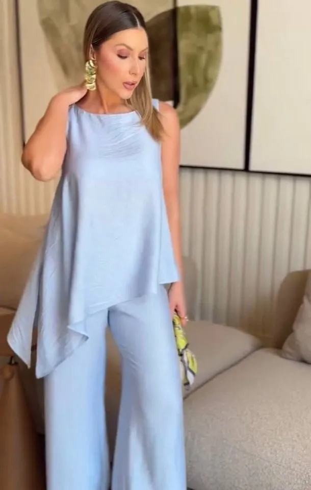 طقم بنطال كاجوال برقبة دائرية وأكتاف منسدلة