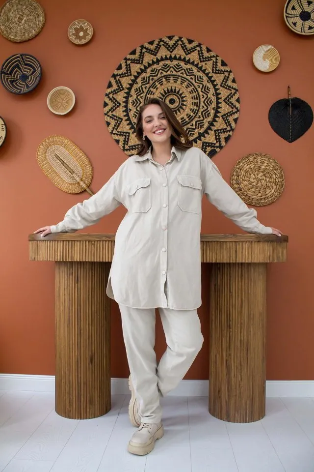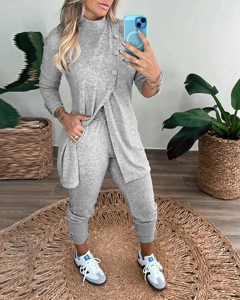 طقم بنطال يومي بغطاء للرأس وأكمام طويلة وتفاصيل متعددة لألوان
