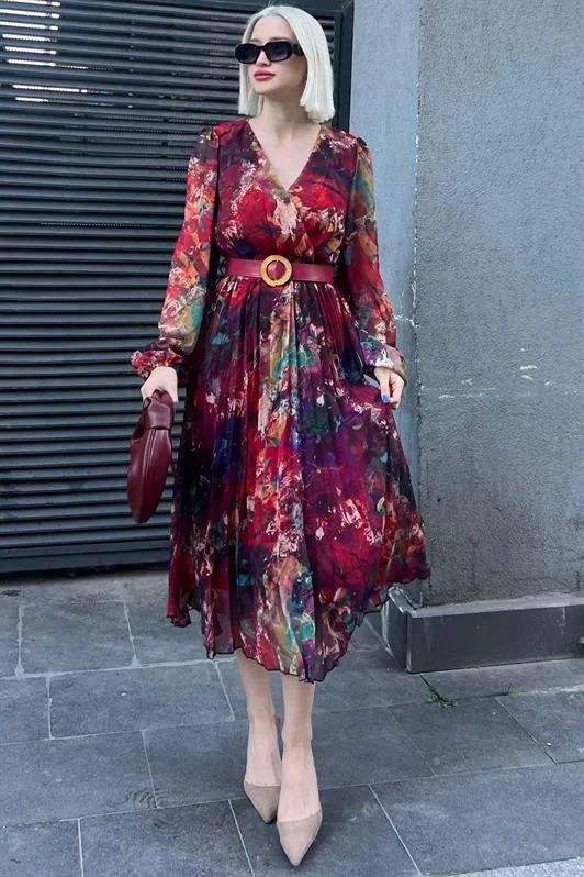 فستان كلوش للنساء بطبعة وأكمام طويلة وياقة نصف عالية