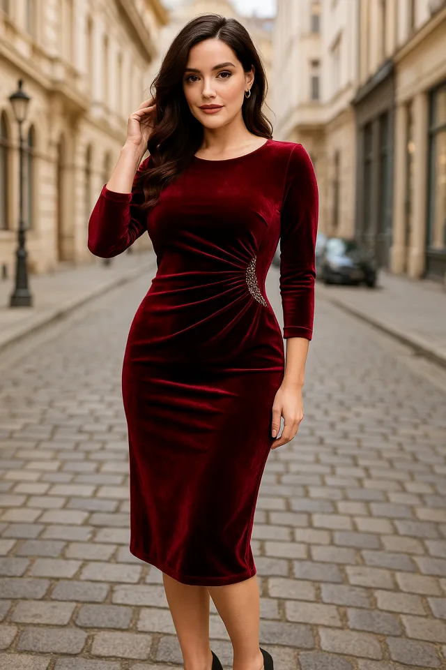 فستان ميدي نمط لف من المخمل بأكمام طويلة وأزرار مزدوجة للنساء