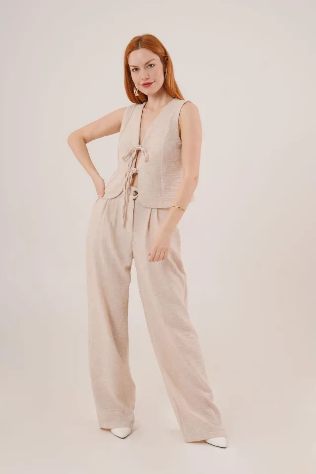 طقم بنطلون بدون أكمام مزدوج الصدر للنساء