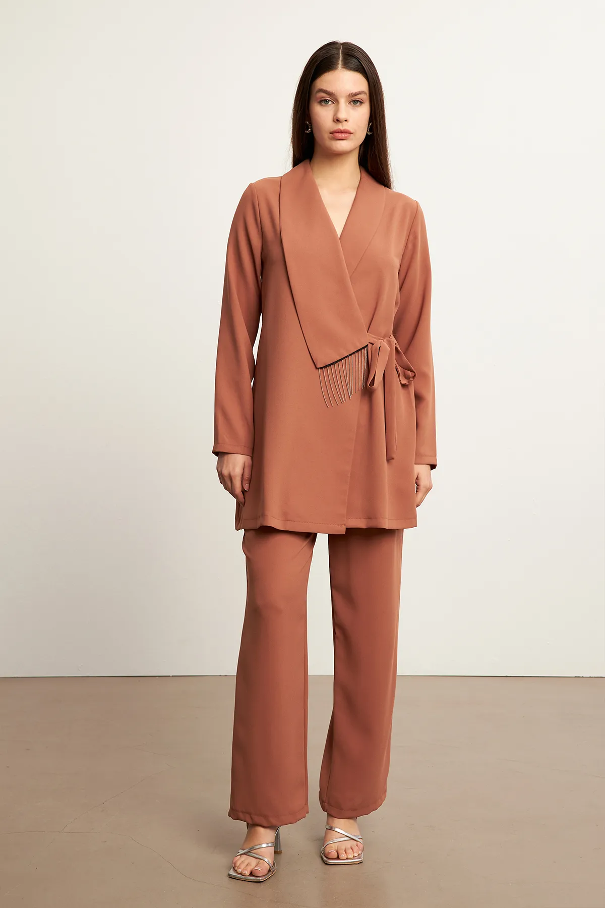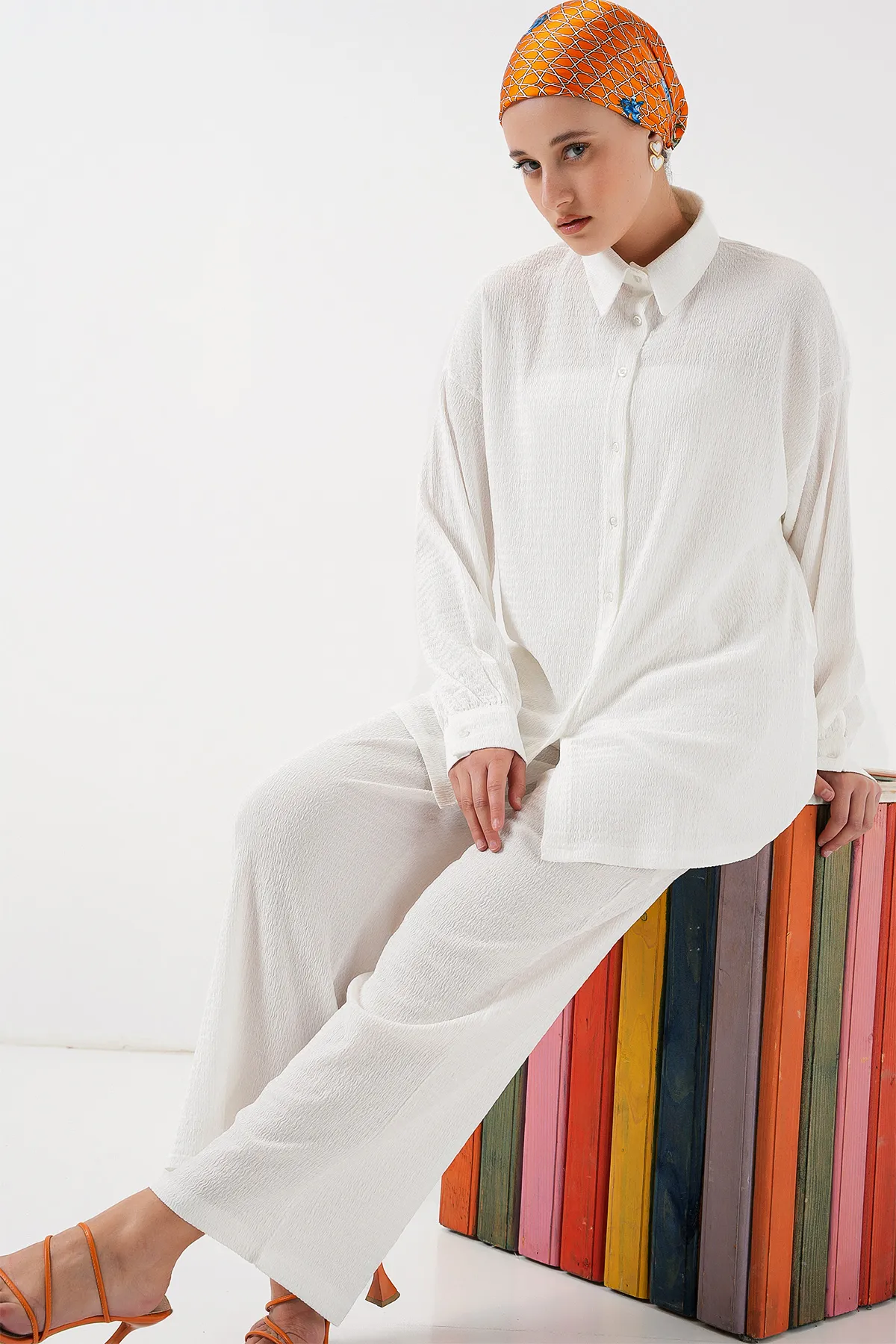 طقم بنطال بأكمام بالونية ورقبة دائرية وتفاصيل ملفوفة للنساء