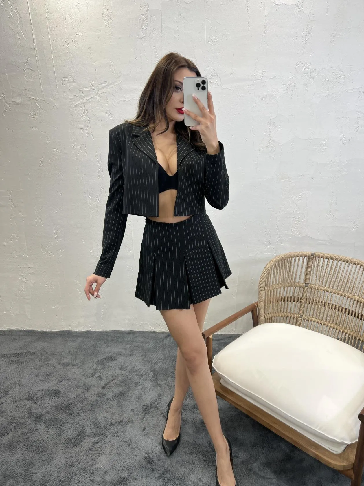 طقم بلوزة سادة بياقة دائرية وتنورة بتفاصيل فتحة جانبية عند الفخذ