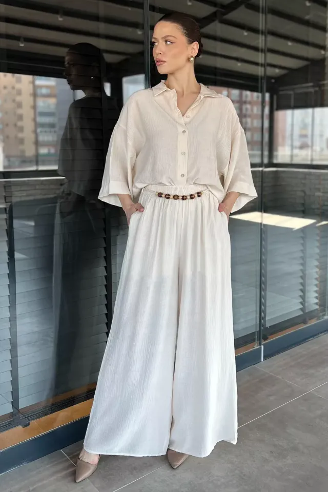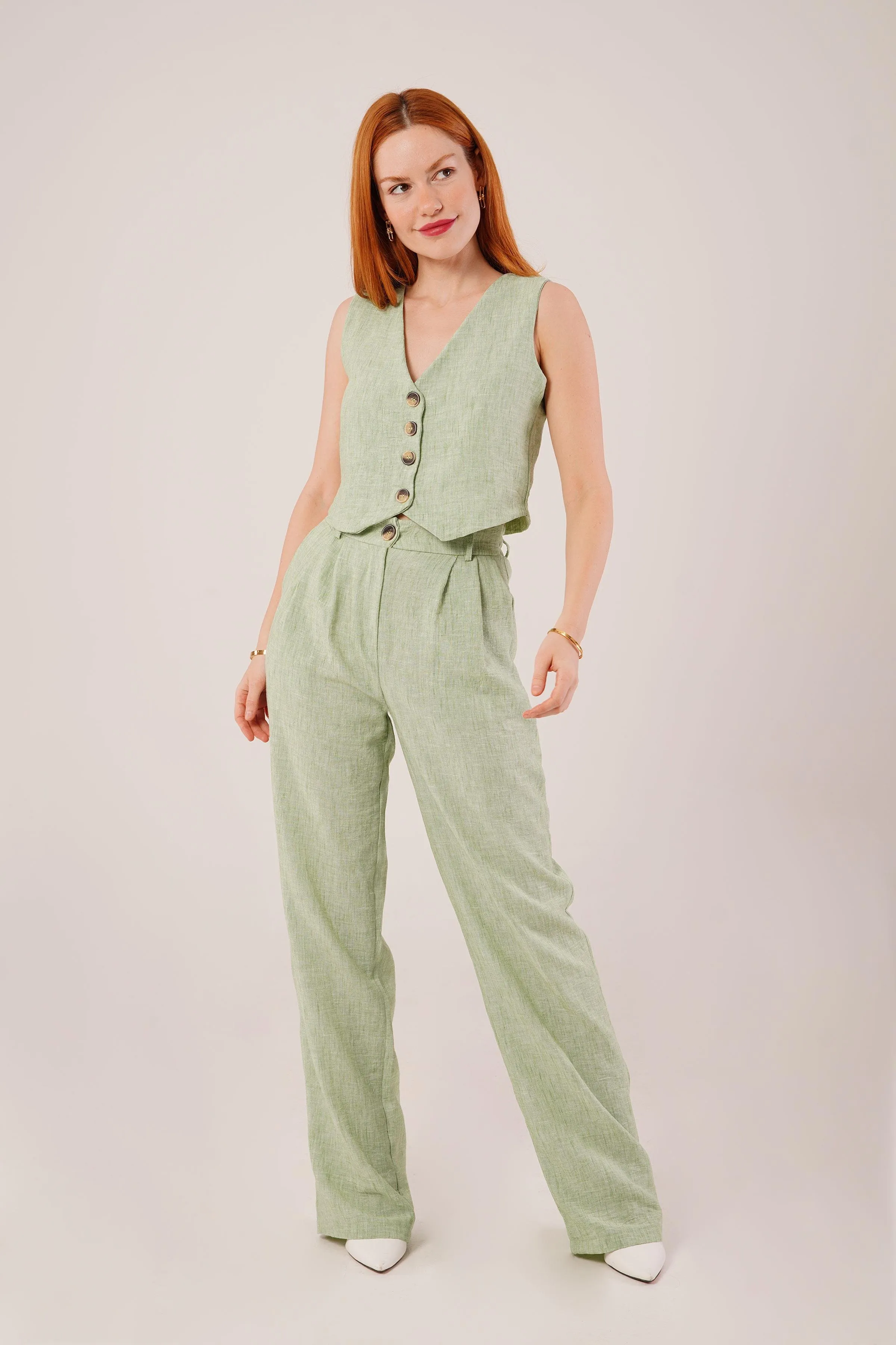 طقم فيست سادة بدون أكمام ورقبة على شكل حرف V وبنطلون واسع الساق