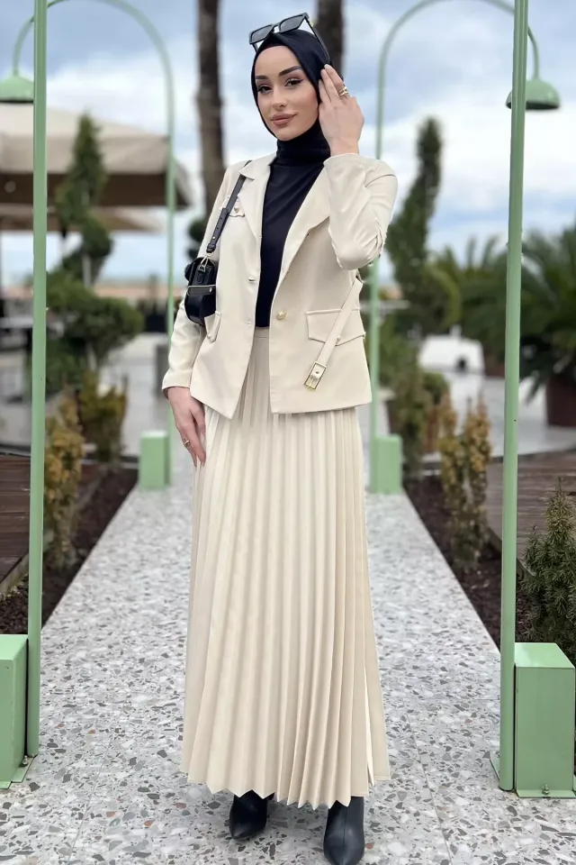 طقم بنطال بأكمام طويلة وأكتاف منسدلة وتفاصيل كشكشة وياقة قائمة