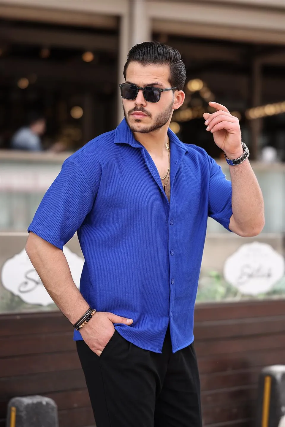قميص رجالي مخطط بأكمام طويلة، مصنوع من ٧٠٪ إيلاستين و٣٠٪ قطن. مرن، ناعم، وأنيق، مثالي لإطلالات أنيقة وغير رسمية. قابل للغسل في الغسالة على درجة حرارة ٣٠ درجة مئوية.