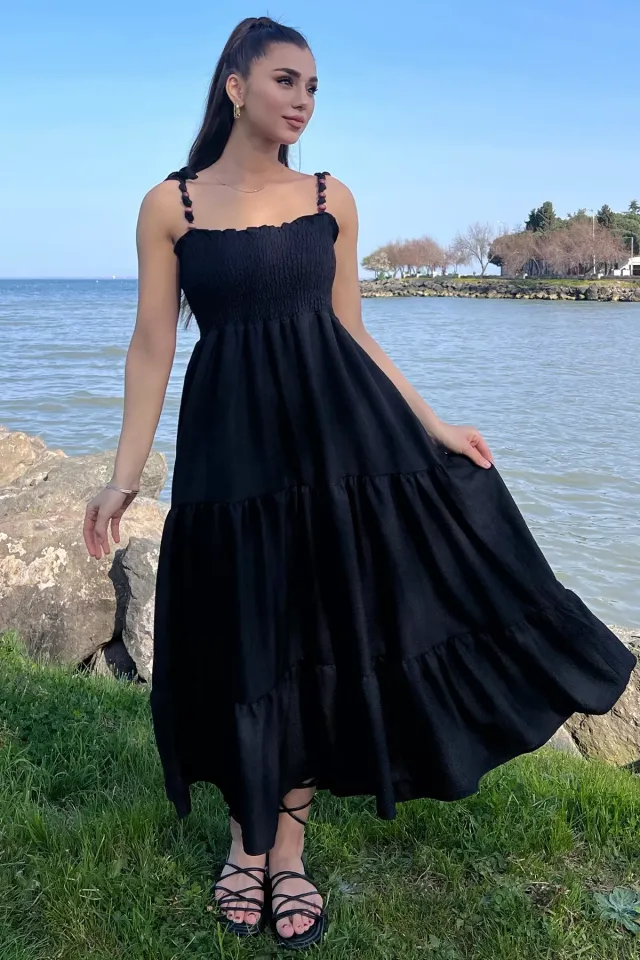 فستان كلوش بكسرات وخصر برباط مع أكمام منفوخة وياقة دائرية، تصميم ناعم بانسيابية مريحة وخطوط أنثوية هادئة