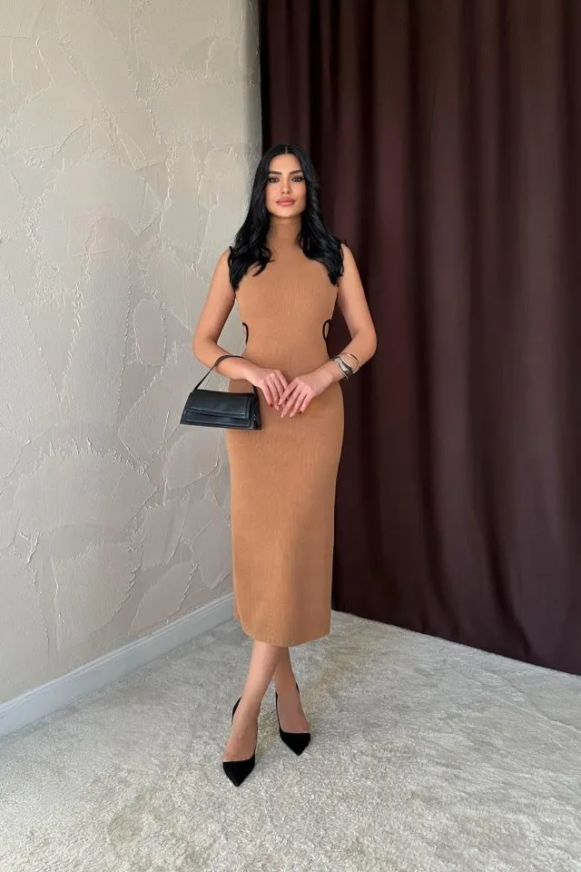 فستان ميدي بحمالات وتفصيلة ربطة من الأمام. قصة ناعمة تناسب الحركة الخفيفة والتنسيقات الصيفية المفتوحة.