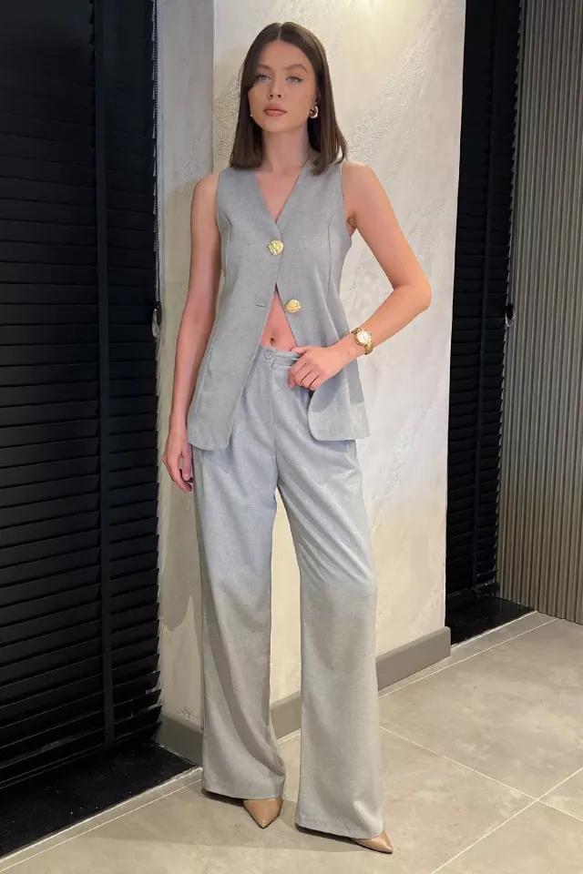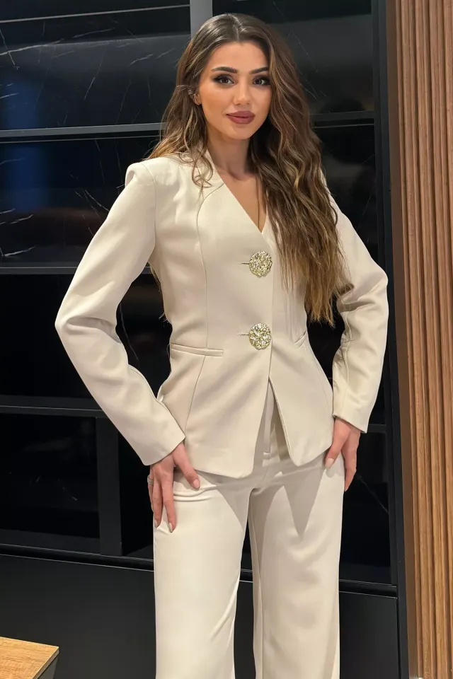 طقم بنطلون بأكمام قصيرة وجيب مزدوج للنساء