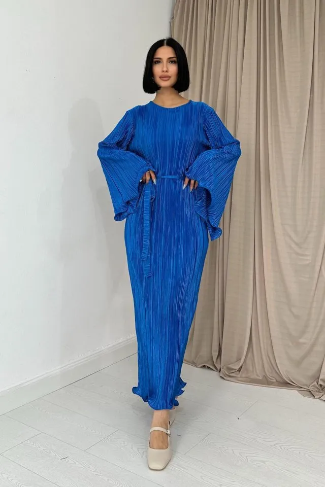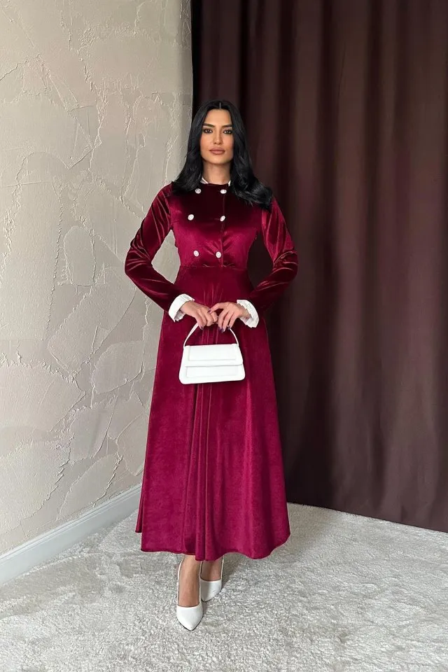 فستان متوسط الطول مزهر من الجاكار بقصة A وياقة عالية مع أكمام بالون وشق جانبي، خيار أنثوي راقٍ لسهرات العيد.