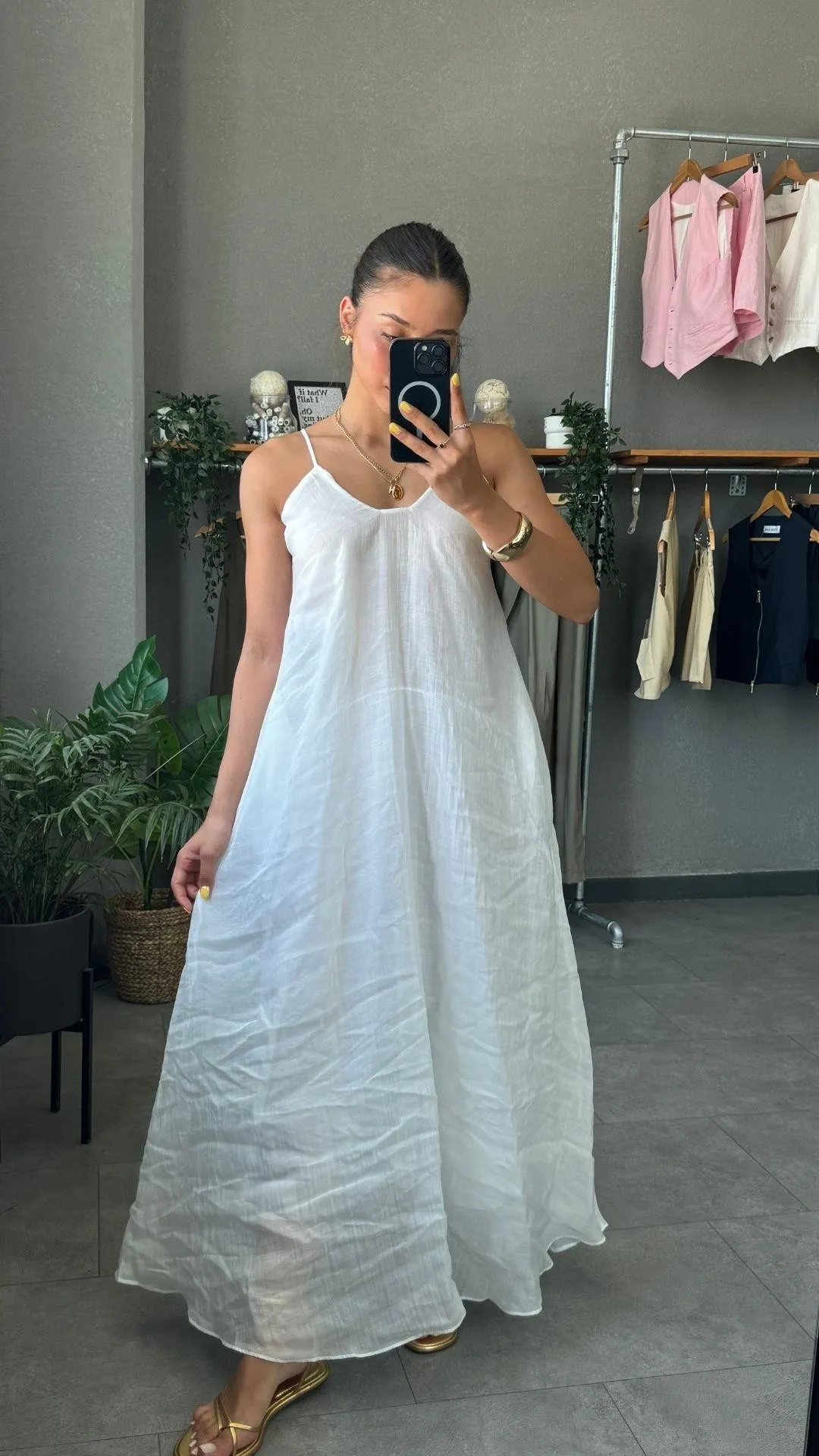 فستان ميني بدون أكمام بياقة دائرية وتفصيل سلسلتين جانبيتين، تصميم أنثوي جريء بقصة واضحة ولمسة معدنية لافتة.