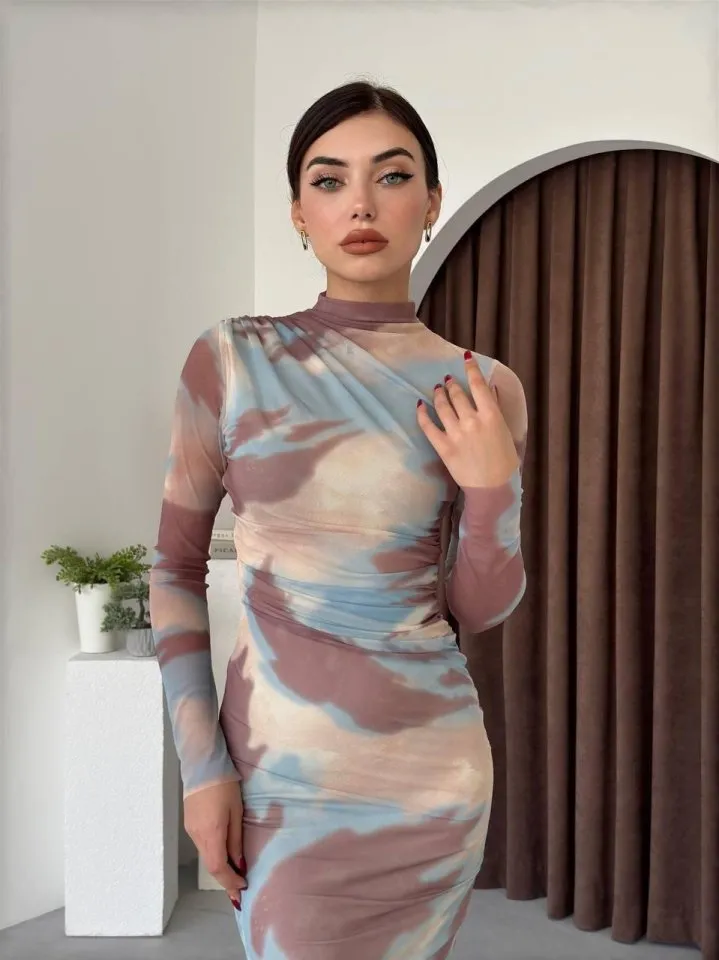 فستان شيفون غير متماثل بأكمام طويلة و تفاصيل طيات للنساء