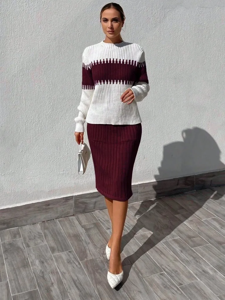 طقم تنورة ميدي محبوكة بياقة مربعة للنساء