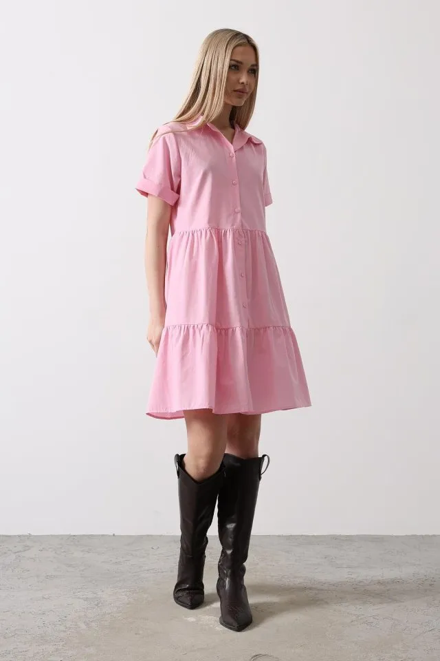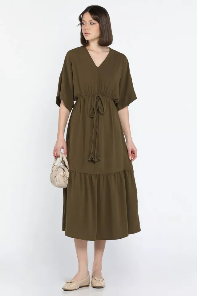 فستان واسع سادة بياقة V وتنورة بكسرات ناعمة، تصميم بسيط مريح مثالي لأيام الصيف المنعشة
