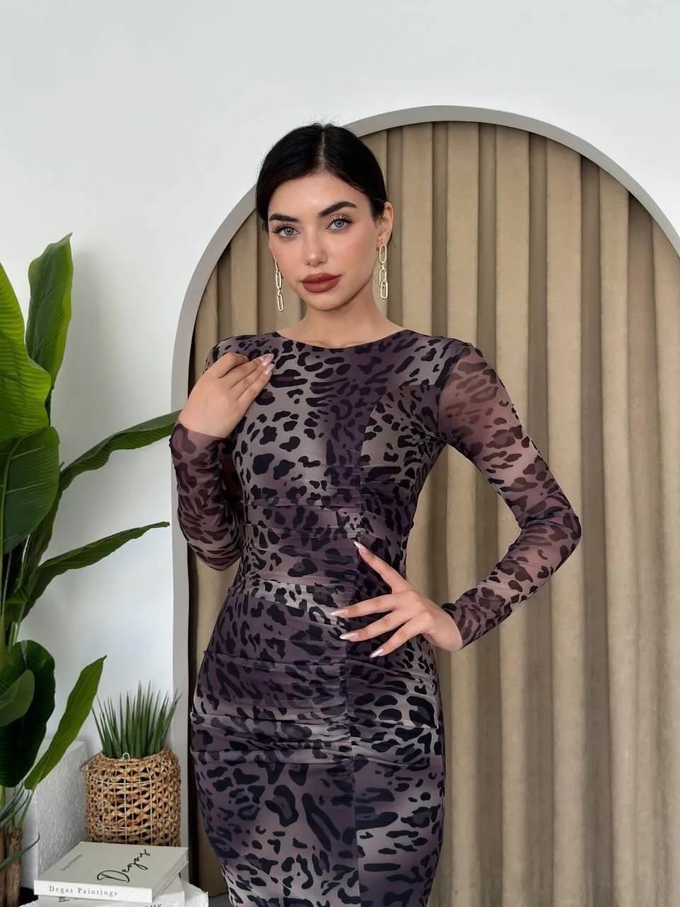فستان واسع بطبعة زيبرا وياقة مزينة بحبات خرز للنساء