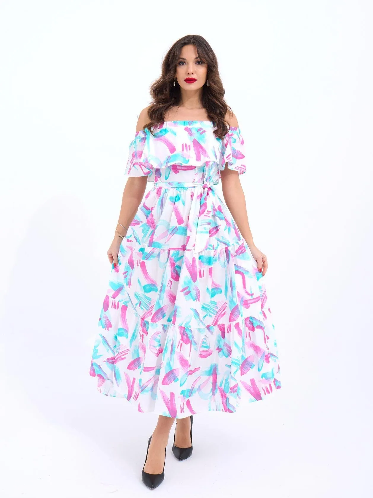 فستان ميدي بنقشة تجريدية وياقة V وأكمام واسعة للنساء