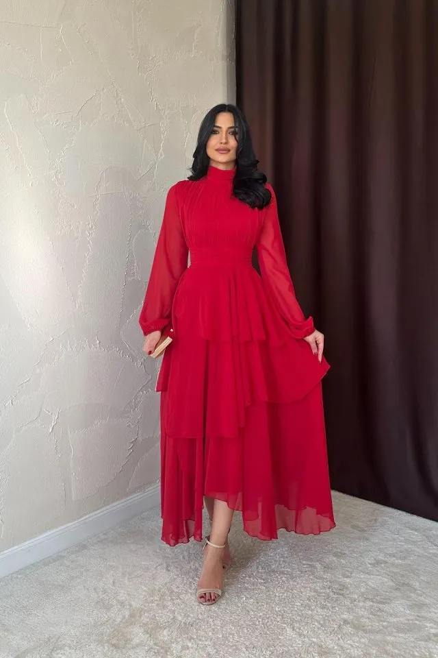 فستان نسائي قصير بلفة أمامية وأكمام منتفخة بقصة مزدوجة الصف