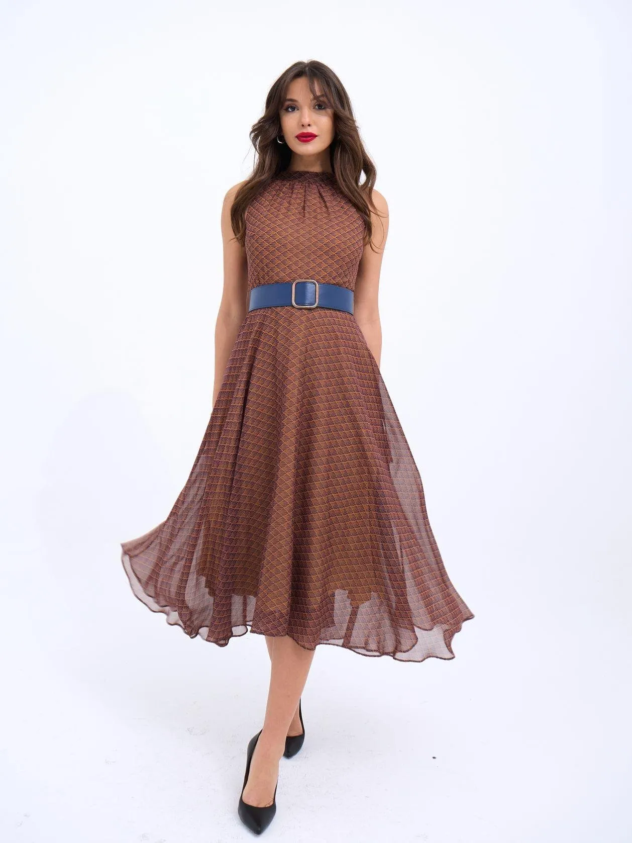 فستان ميدي تريكو بدون أكمام بياقة V وتفاصيل منسوجة للنساء