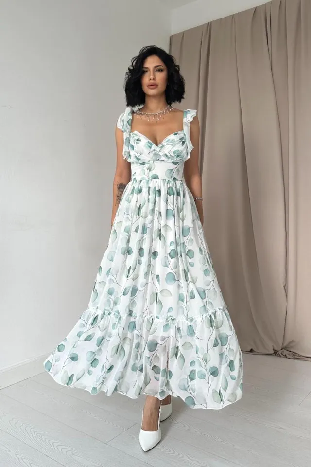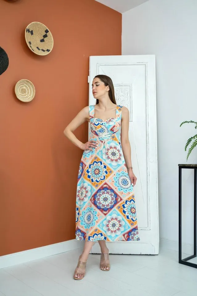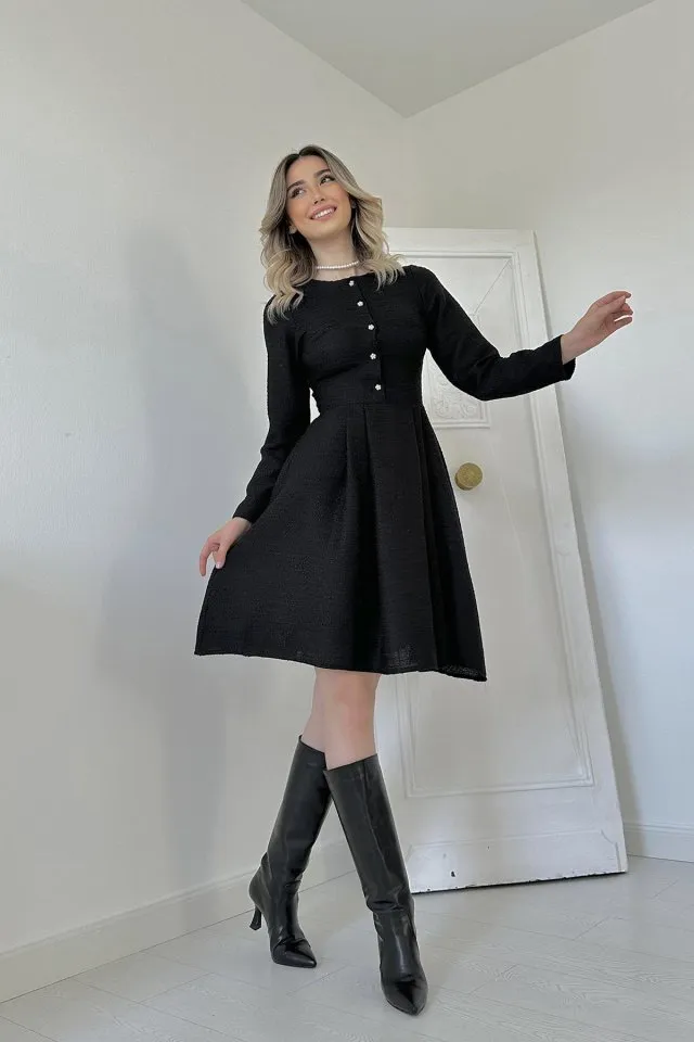 فستان كلاسي متعدد الألوان برقبة غير متماثلة وتفاصيل أزرار