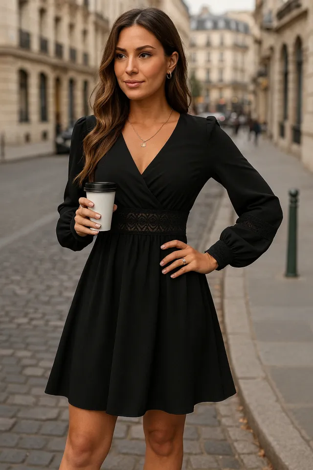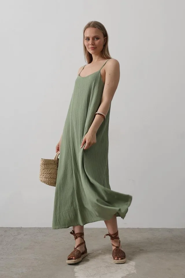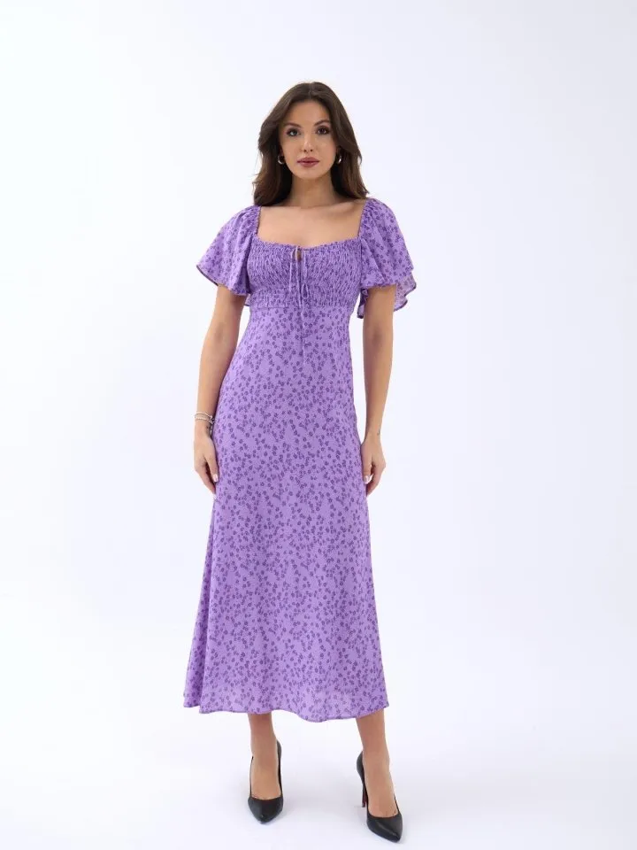 فستان ميدي من قماش السويد الناعم بياقة نصف مرتفعة، بتصميم ناعم يبرز جمال القَصة بخامة أنيقة.