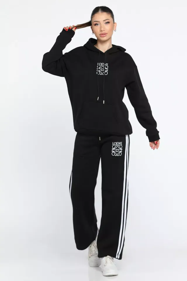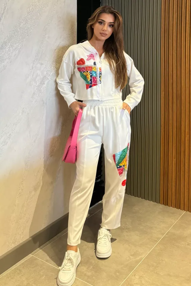 طقم بنطلون ضيق مع توب بأكمام طويلة وياقة V مطرز للنساء