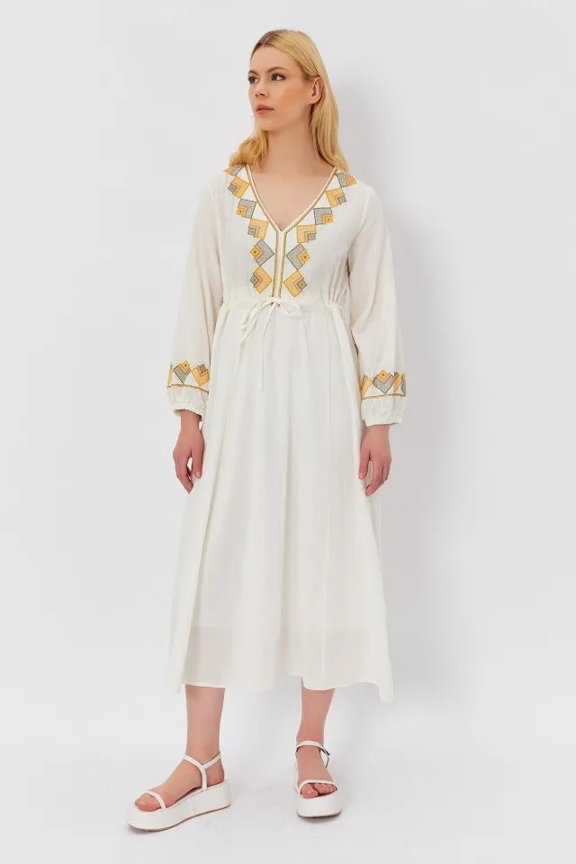 فستان ميدي مزهر بياقة مربعة وأكمام منفوخة. قصة واسعة تناسب الحركة الناعمة والتنسيقات اليومية الهادئة.