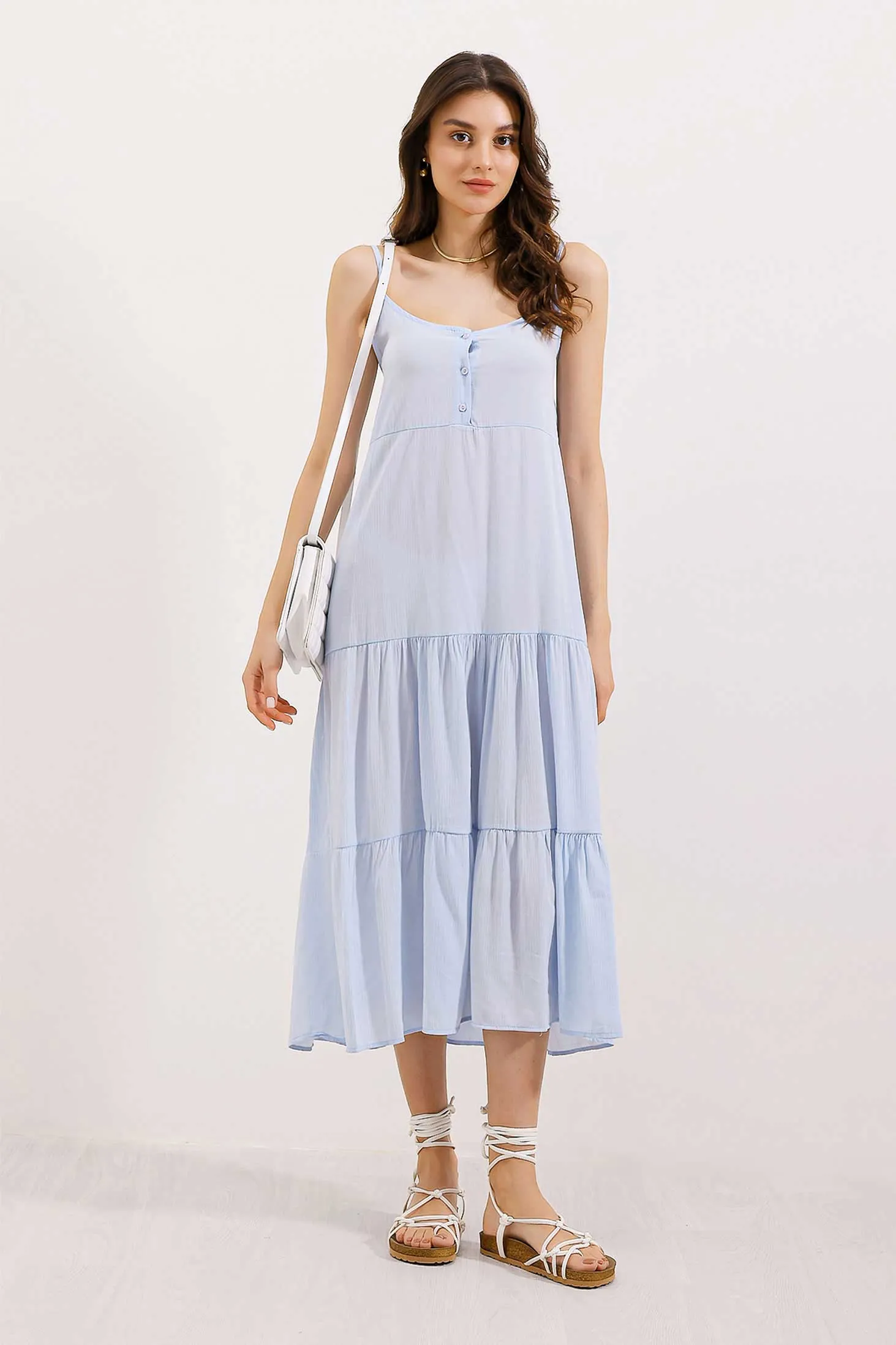 فستان نسائي قصير سادة بتفصيلة سحاب وتنورة بكسرات وياقة دائرية، بقصة كلوش بدون أكمام لإطلالة صيفية منعشة.