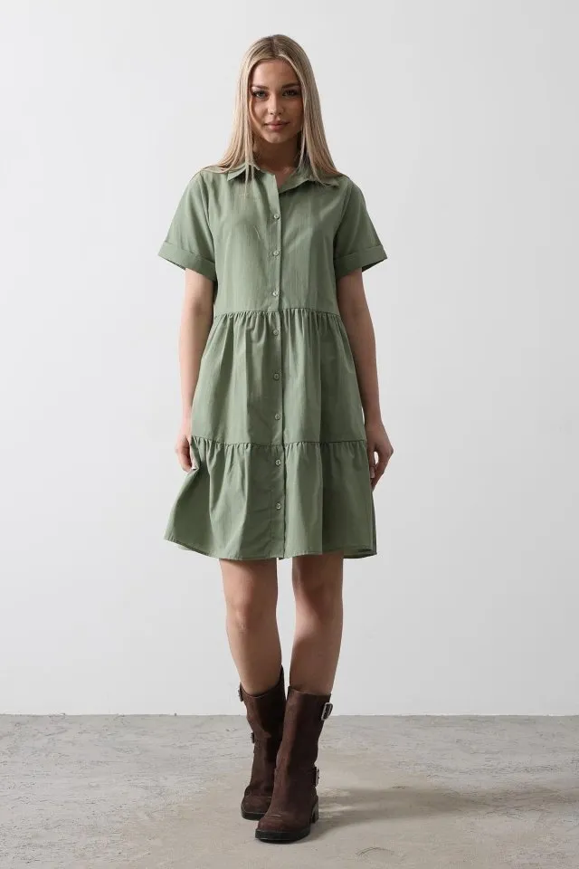 فستان نسائي قصير سادة بتفصيلة سحاب وتنورة بكسرات وياقة دائرية، بقصة كلوش بدون أكمام لإطلالة صيفية منعشة.