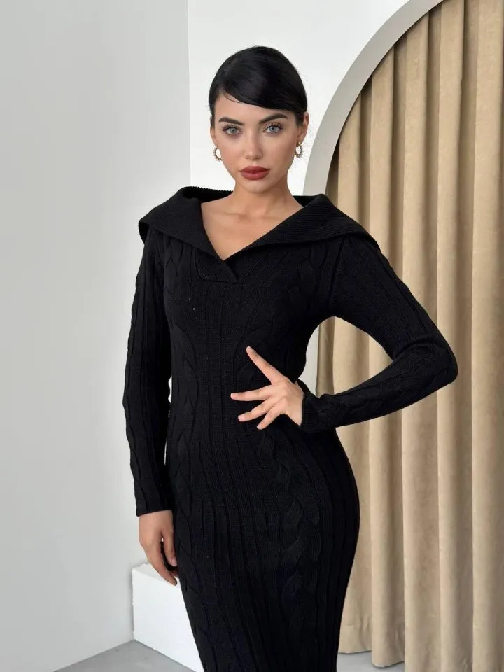 فستان ضيق بياقة عالية واكمام طويلة مع تفصيلة تول شفافة عند الصدر، بتصميم سادة وانسيابي يناسب الاطلالات المسائية الجريئة للنساء.
