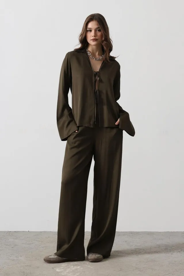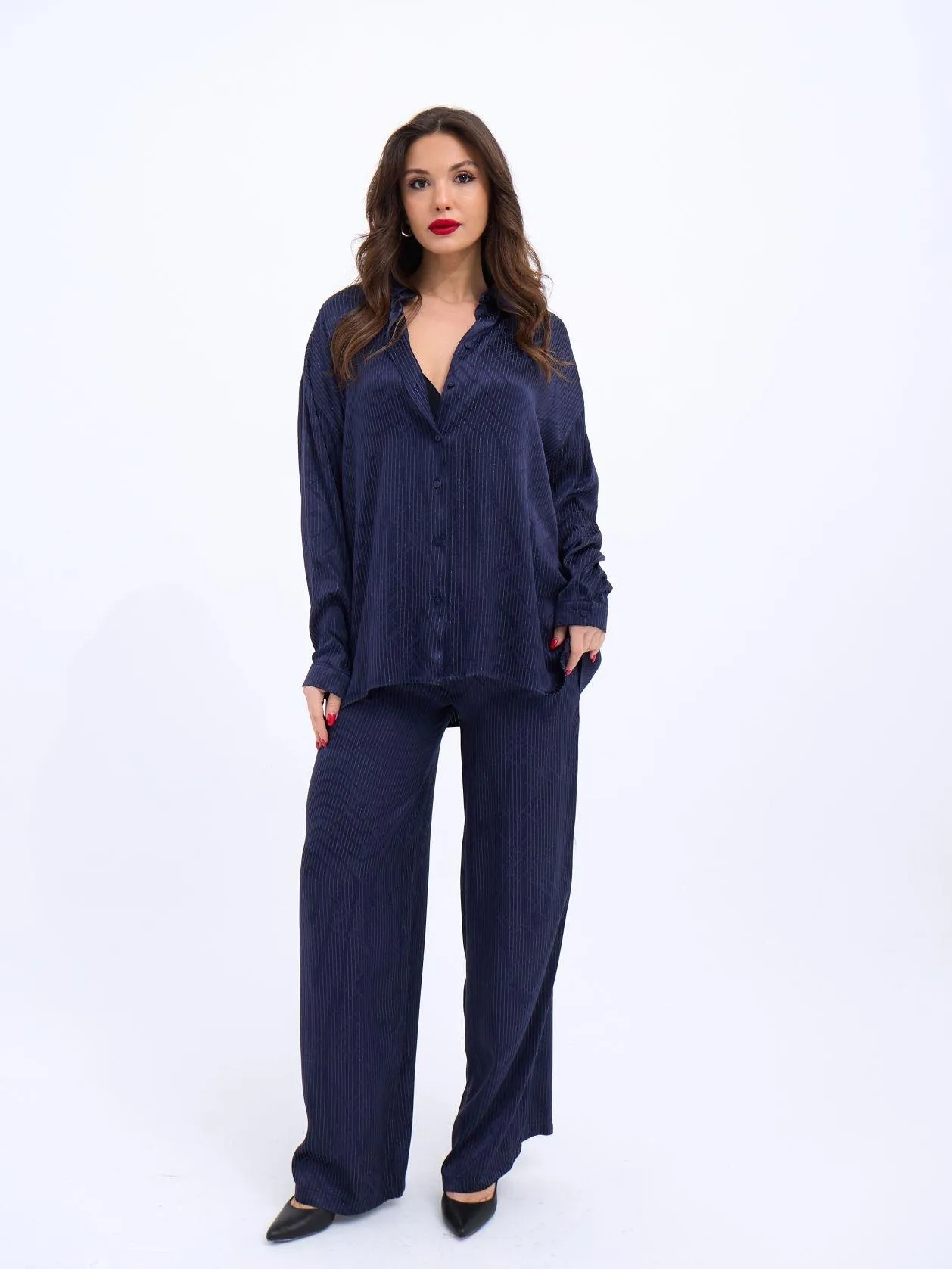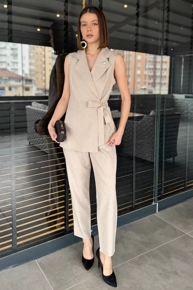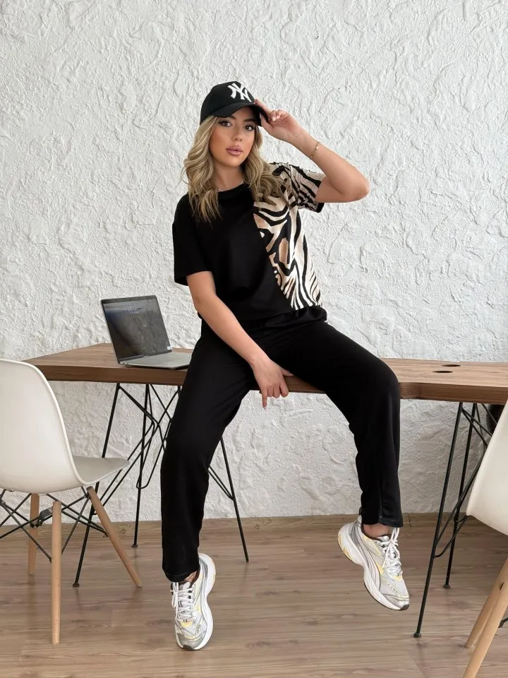 طقم بنطلون بأكمام قصيرة و تفاصيل مخططة للنساء