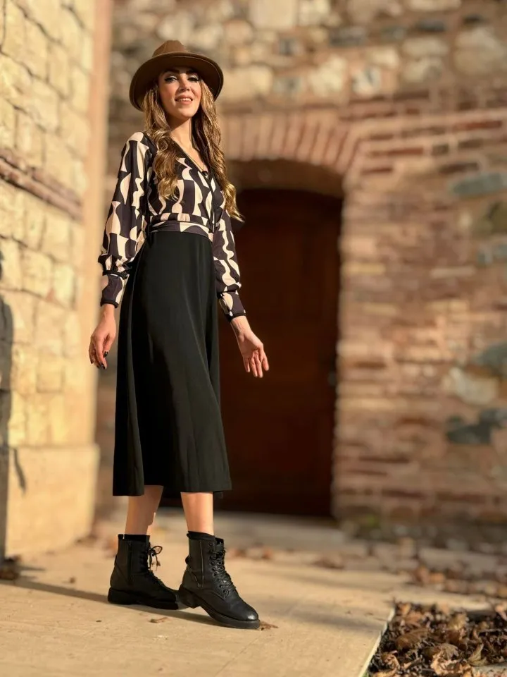 فستان كلوش من برودرية بياقة مربعة مزين بدانتيل وأكمام منفوخة وتنورة بكسرات للنساء، تصميم رومانسي ناعم بملمس أنثوي وقصة كلاسيكية.