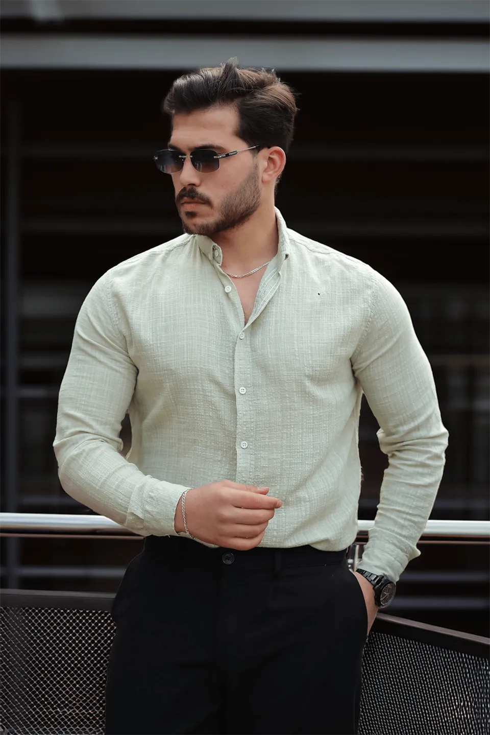 قميص رجالي منقوش بأكمام طويلة وياقة كلاسيكية، مصنوع من 100% كيتن لإطلالة أنيقة وخفيفة الوزن وجيدة التهوية. مثالي للأجواء الدافئة والمناسبات غير الرسمية. قابل للغسل في الغسالة على درجة حرارة 30 درجة مئوية.