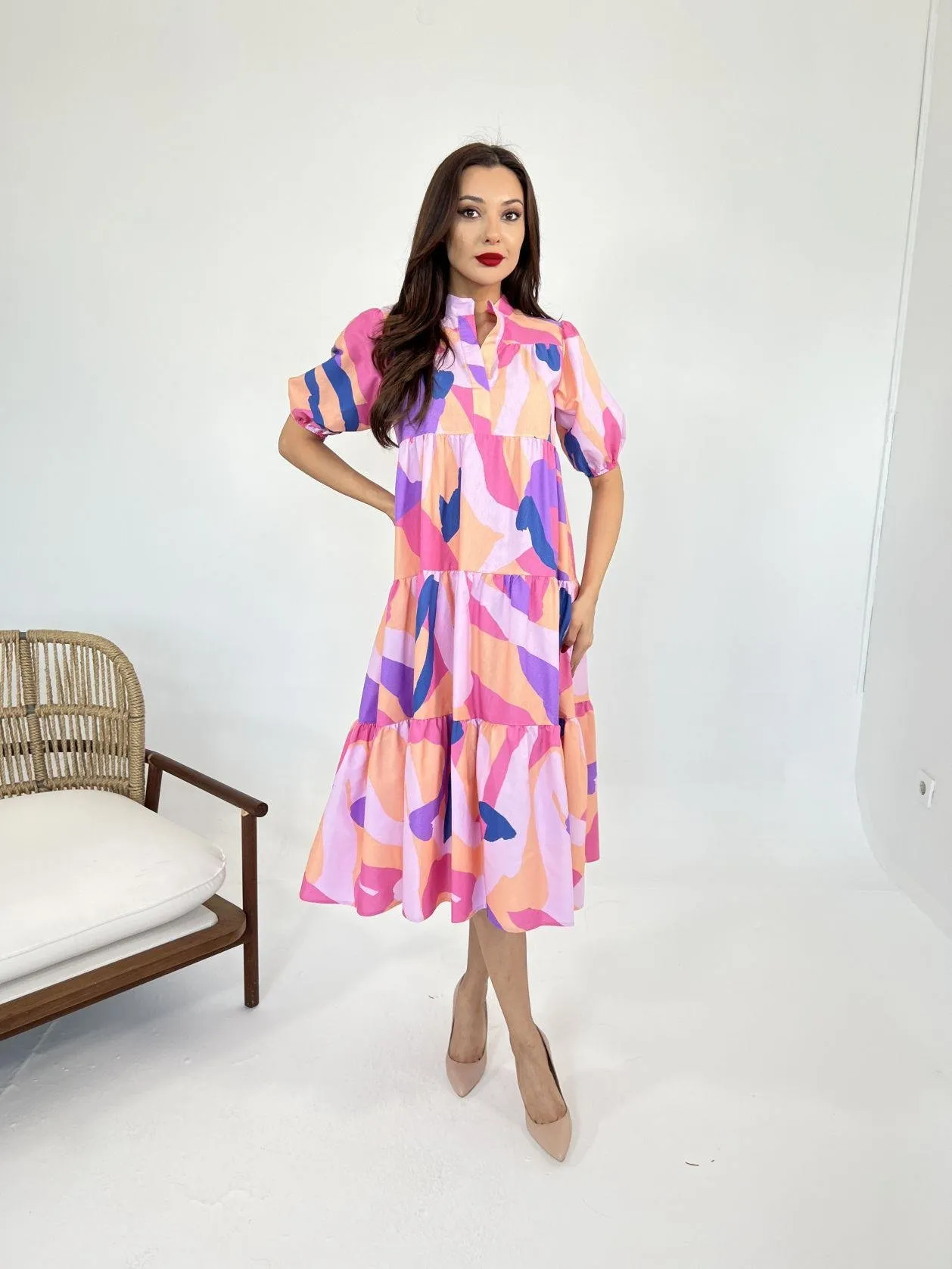 فستان ميني بنقشة مربعات بياقة دائرية بدون أكمام وتفصيل كشكش. قصة كلوش خفيفة لإطلالات صيفية ناعمة للنساء.