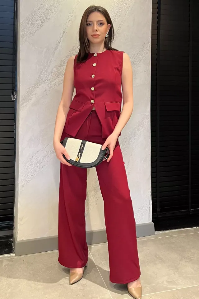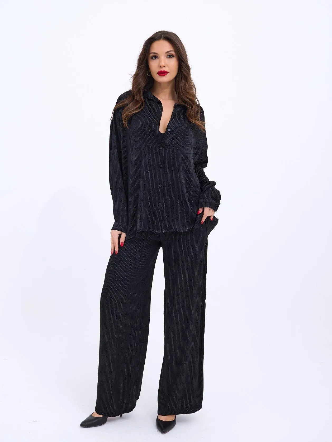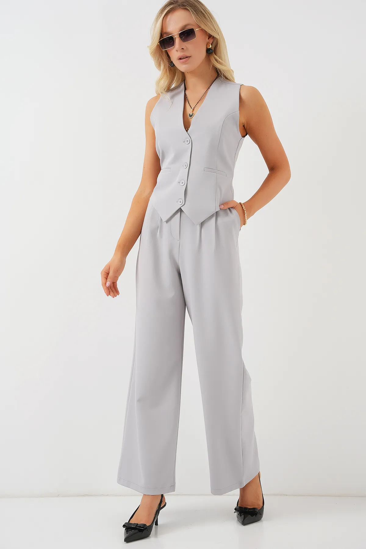 طقم بنطلون للنساء واسع الساق بأكمام نصفية وكتف منسدل وياقة على شكل حرف V