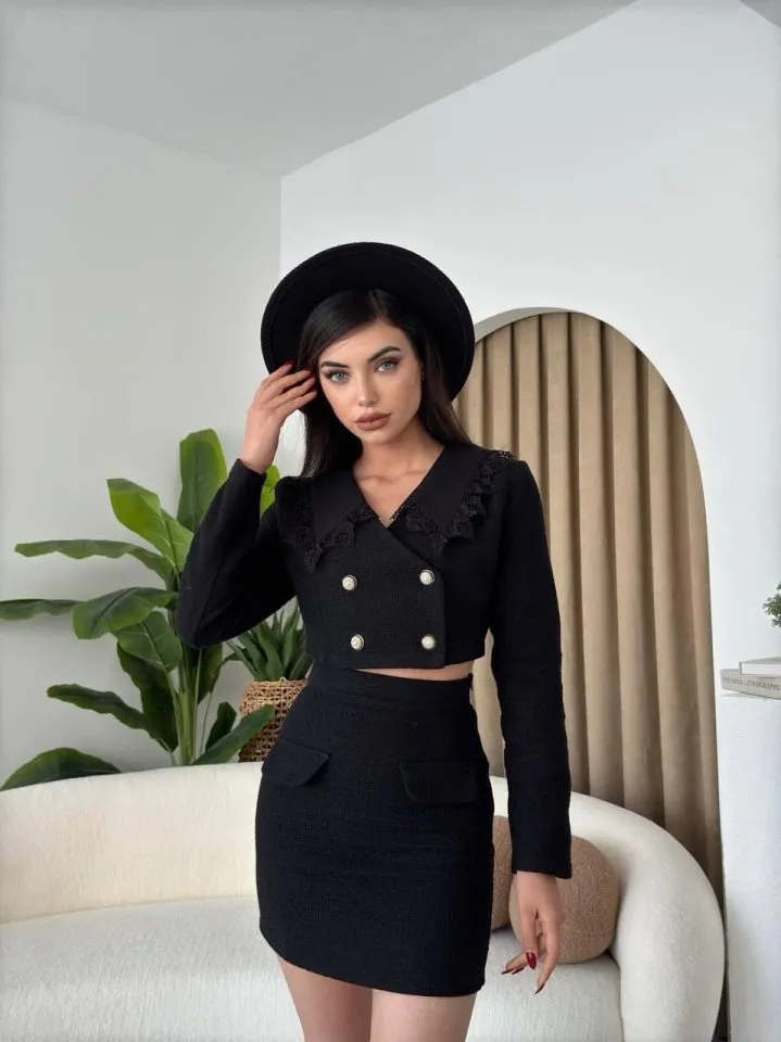 طقم فيست مخطط بياقة هالتر و تنورة قصيرة للنساء