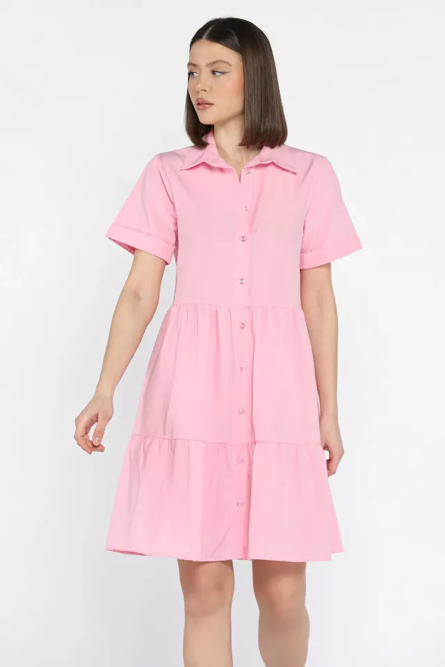 فستان ميني بدون أكمام بياقة قميص وأزرار أمامية مع قصة محددة. قطعة كاجوال أنيقة تناسب الأيام الدافئة وسهولة التنسيق.