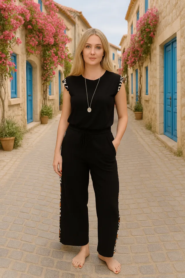 طقم قميص بأزرار منقوش وبنطلون واسع الساق للنساء