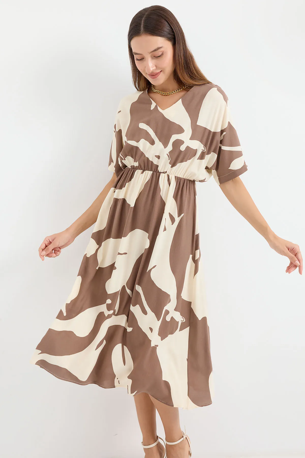 فستان ميدي منقوش بقصة A-Line بطبقات وأكتاف مكشوفة مع أكمام قصيرة لإطلالة يومية ناعمة